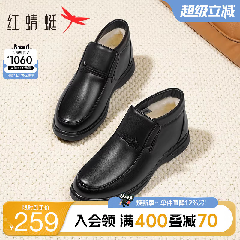 红蜻蜓男士棉鞋冬季新款羊毛休闲真皮高帮加绒皮鞋保暖中年爸爸鞋