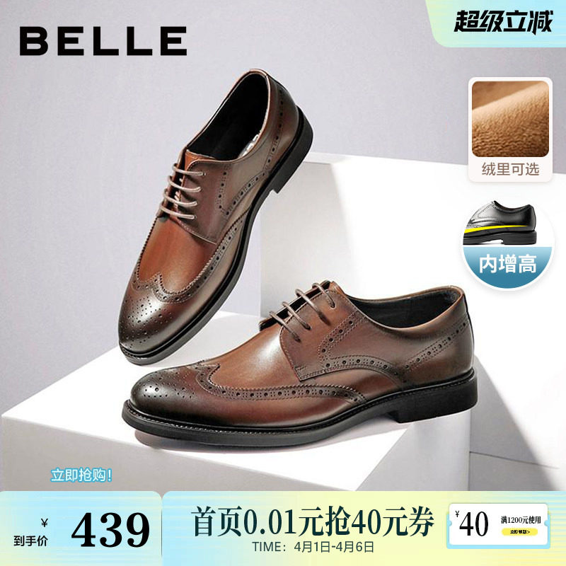 百丽男鞋布洛克牛皮结婚鞋冬加绒内增高商务休闲正装皮鞋89183AM9