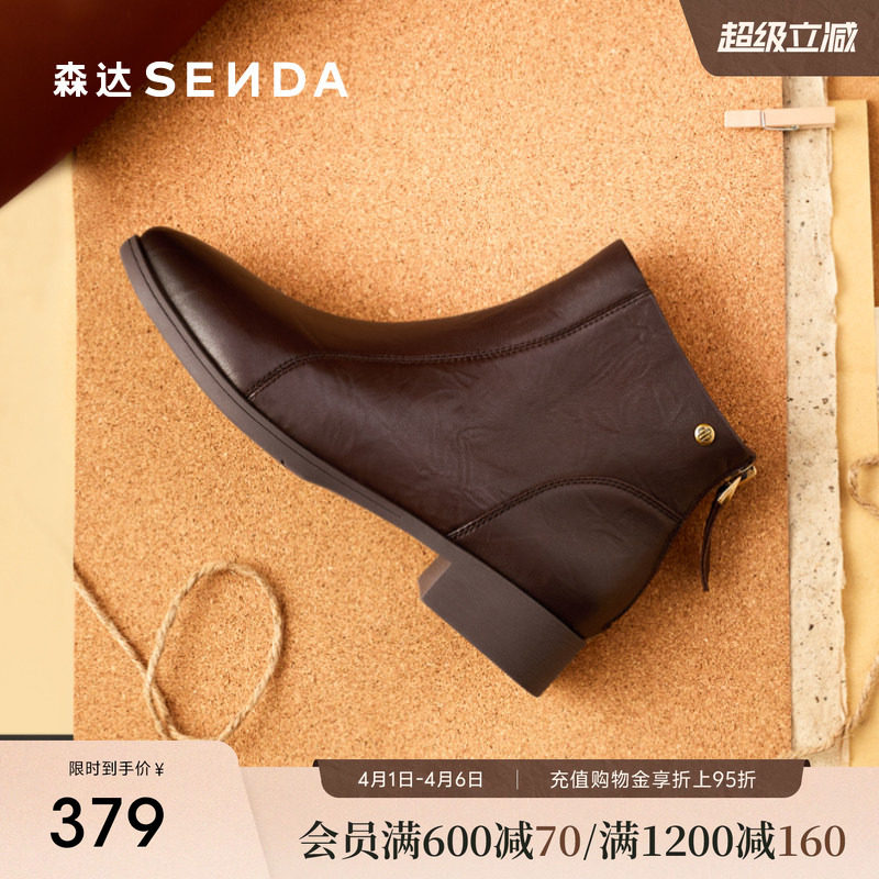 森达羊皮休闲靴女2025冬季新款商场同款平底粗跟皮鞋4T6B5DD5