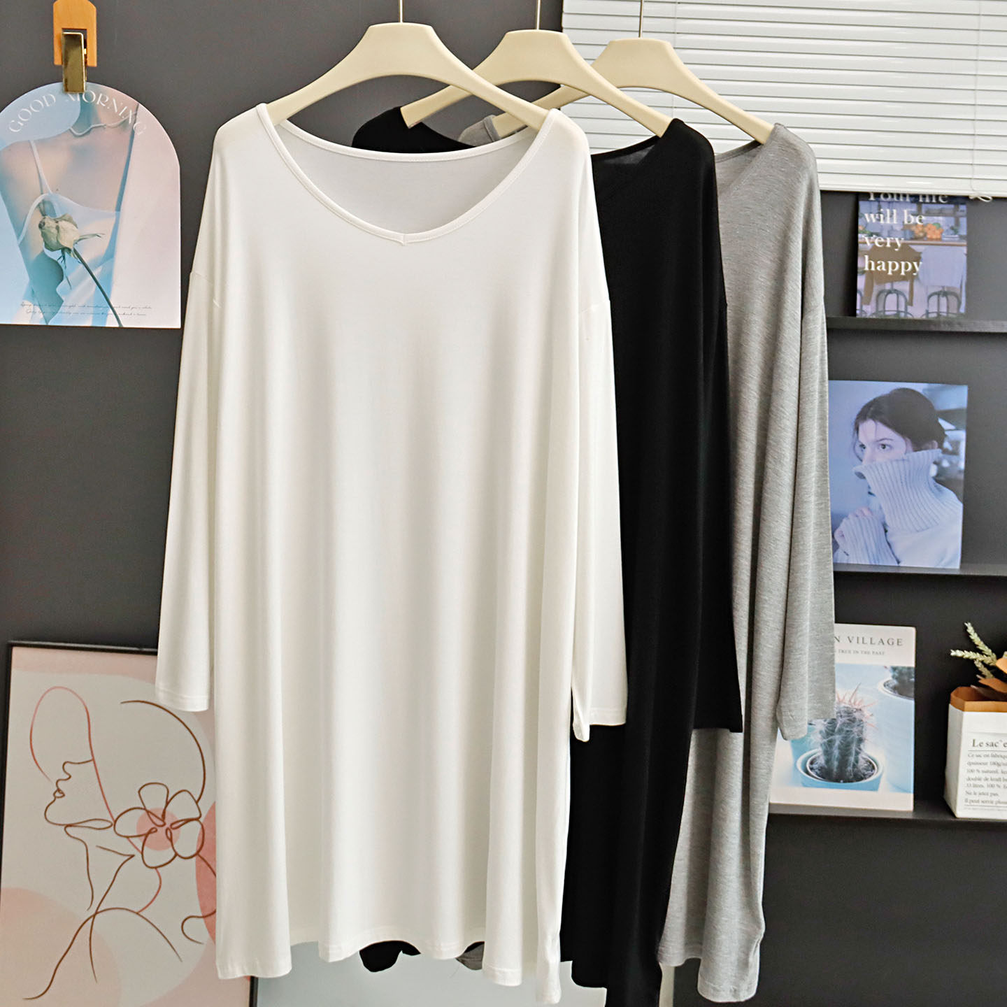 春秋季中长款莫代尔V领长袖T恤裙慵懒风宽松大码睡裙孕妇连衣裙薄