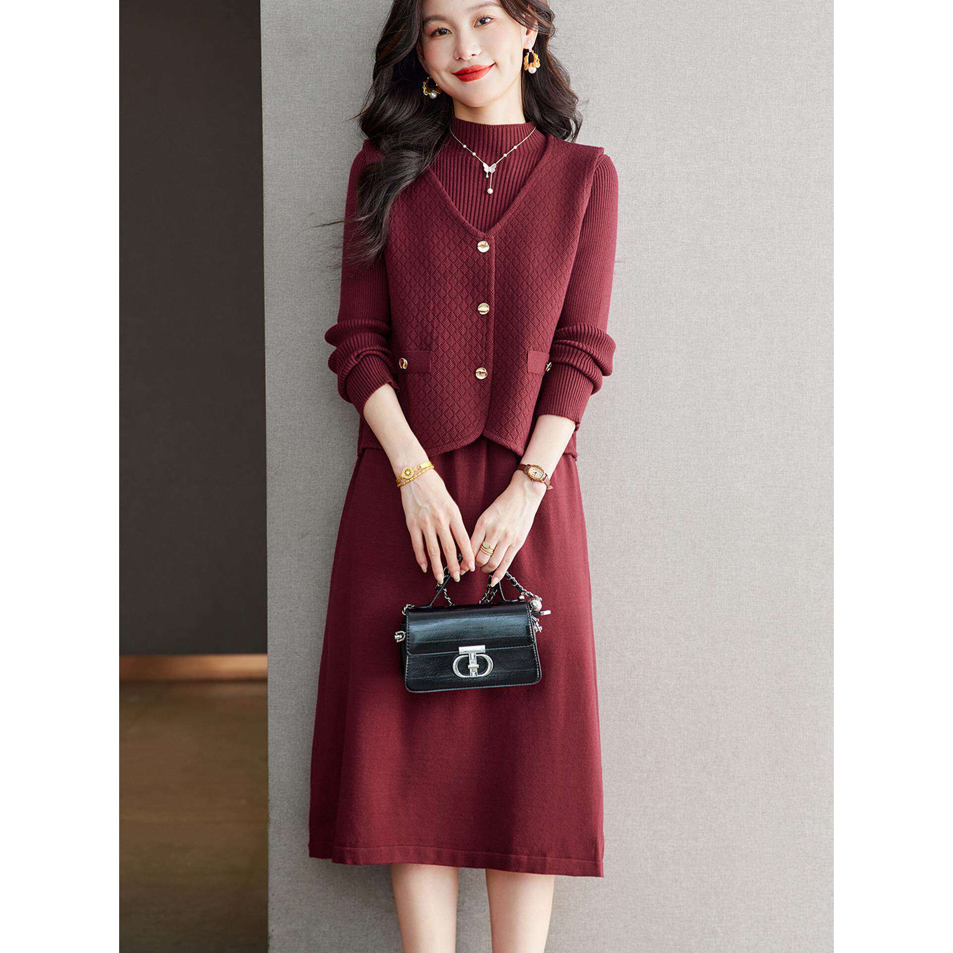 阔色新中式红色开衫外套背心裙子两件套装女25秋冬季毛衣连衣裙