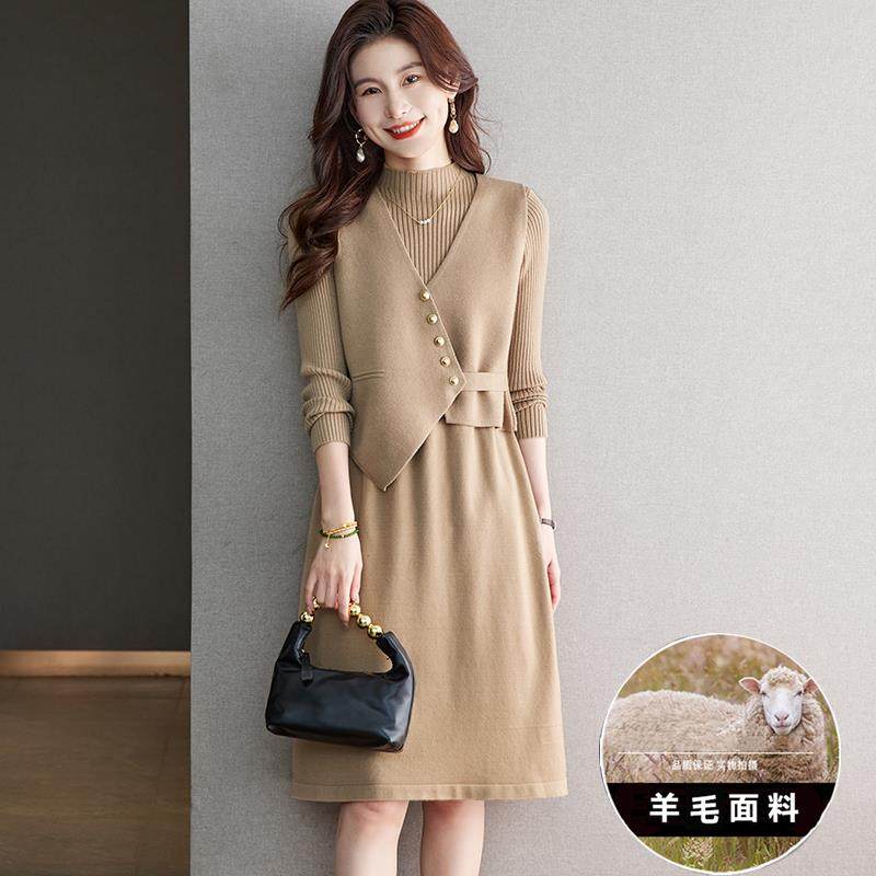 秋冬厚款鄂尔多斯市收腰连衣裙显瘦两件套中长款打底毛衣裙子套装