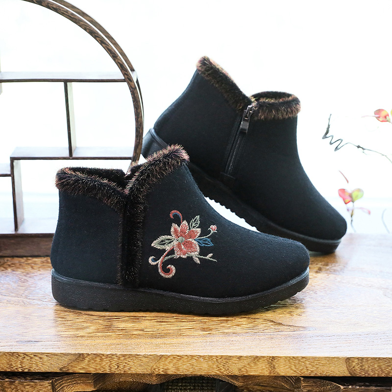 秋冬新款复古绣花棉靴老北京布鞋平跟加绒妈妈棉鞋中老年棉鞋女鞋