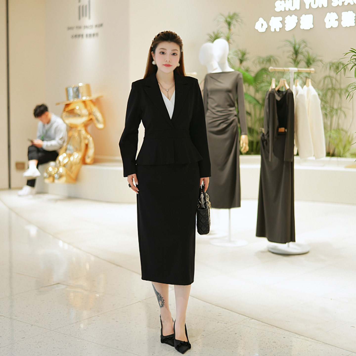 大码西装半身裙中长款秋冬2025新款a字高腰开叉一步裙百搭小黑裙