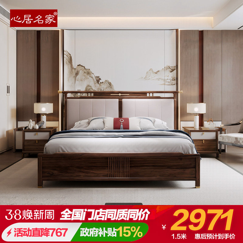 实木床新中式官帽乌金木卧室双人真皮主卧1.8米心居名家【特价】