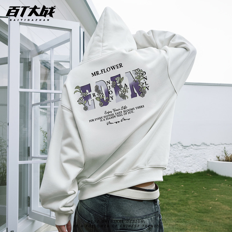 美式森女系伊甸园花朵印花连帽卫衣女生秋冬加绒休闲重磅情侣帽衫