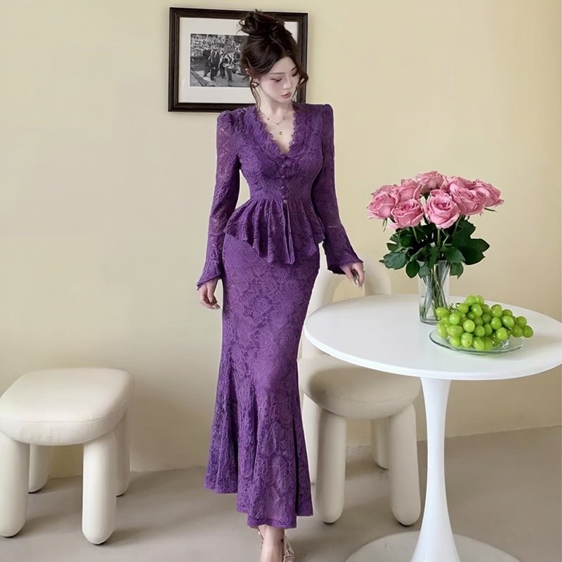 御姐风V领收腰长袖性感鱼尾裙女 2025秋冬季轻熟套装裙蕾丝连衣裙