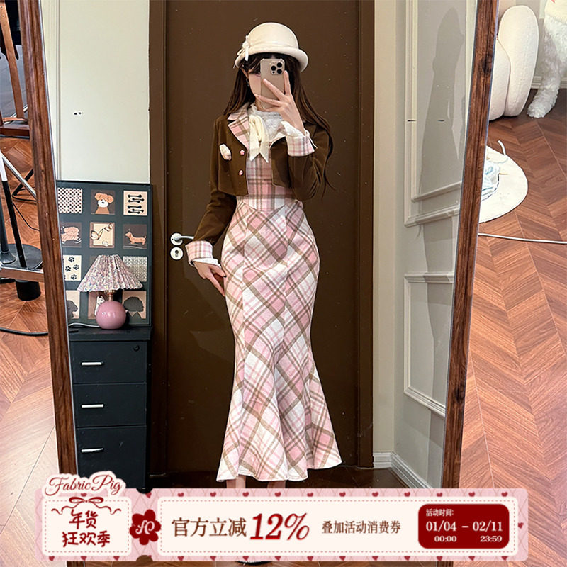 织物猪Fabricpig焦糖草莓 复古千金感鱼尾裙套装女秋包臀连衣裙子