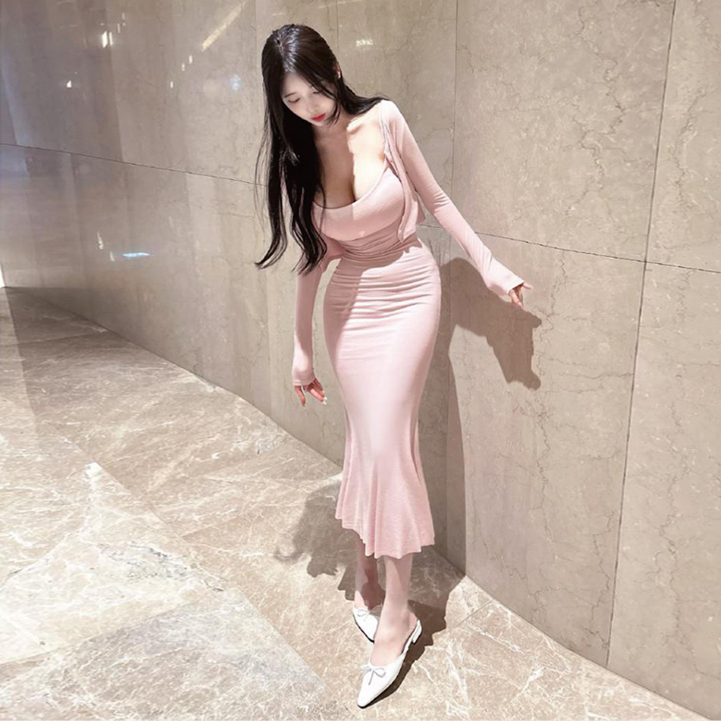 YoungGirlDay卡戴珊性感包臀鱼尾吊带连衣裙拖地长裙长袖开衫套装