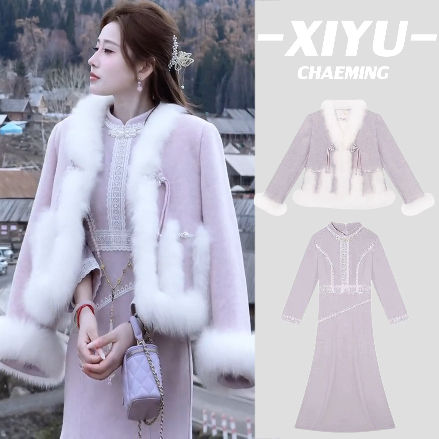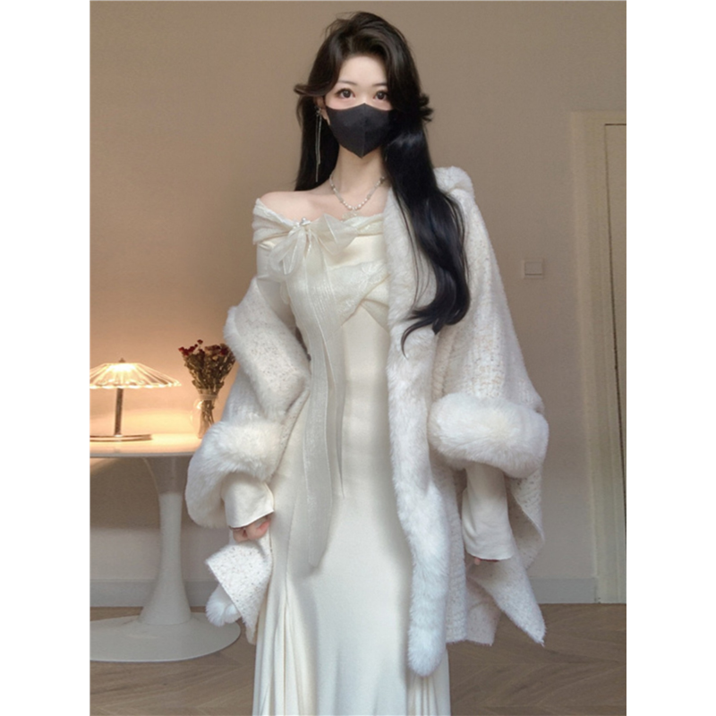 留洋白月光慵懒风披肩开衫秋冬季设计感鱼尾旗袍两件套装女连衣裙