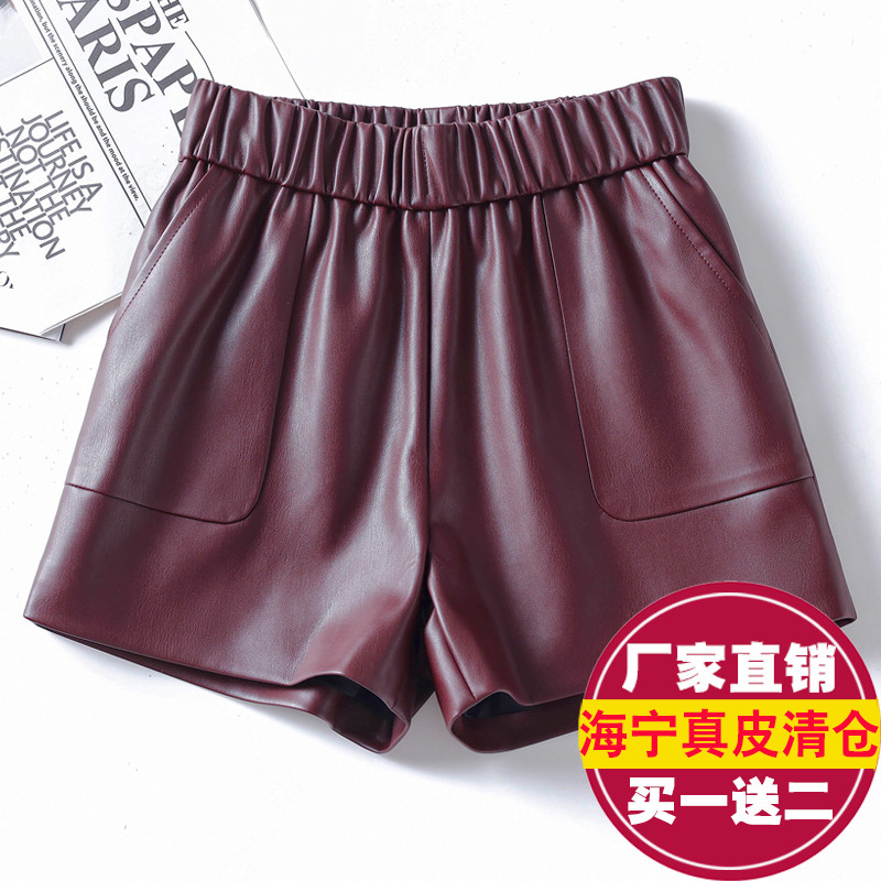 海宁真皮短裤女士高腰显瘦裤子秋季新款松紧皮裤高档绵羊皮阔腿裤