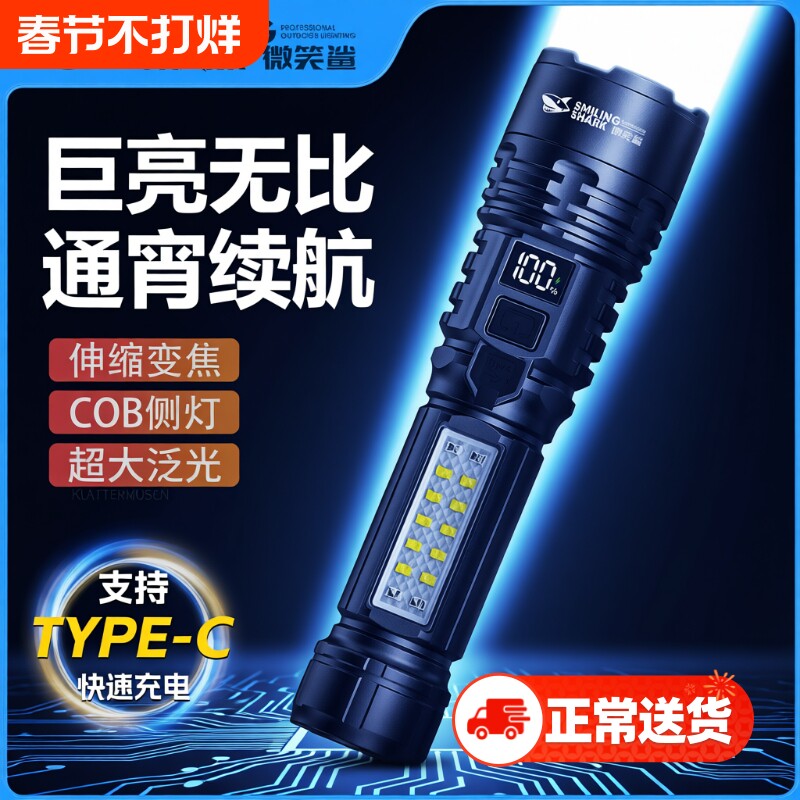 强光手电筒充电微笑鲨2025新款超级长续航耐用便携家用氙气照明灯