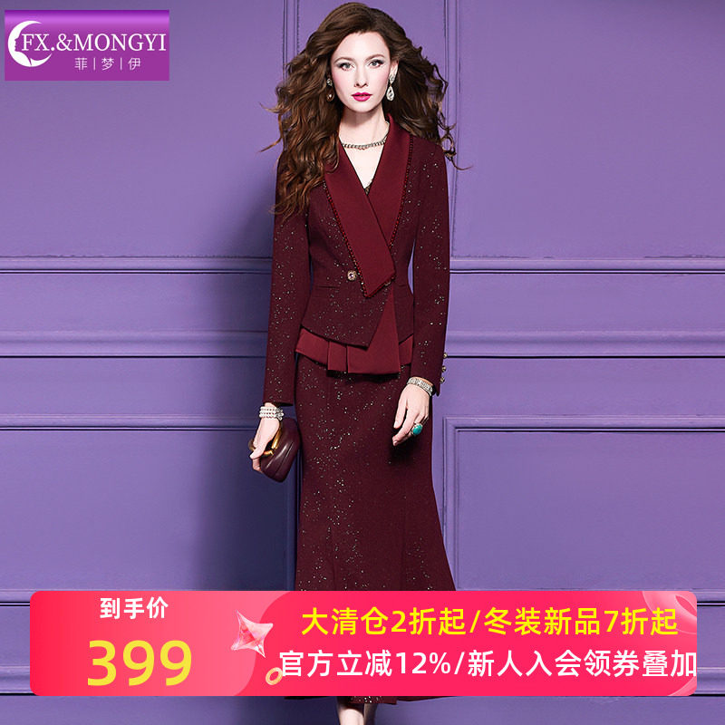 菲梦伊亮片红色西装套装裙女冬季轻熟气质修身上衣鱼尾半裙两件套