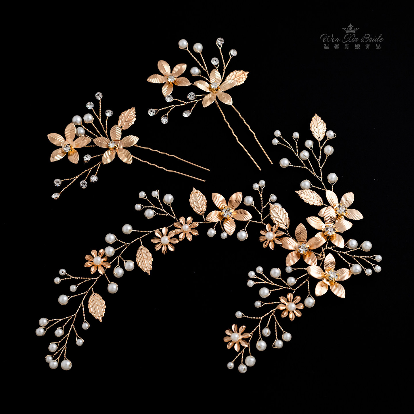 金色叶子花朵手工头饰新娘结婚饰品软链发绳盘发珠花发饰U夹套装