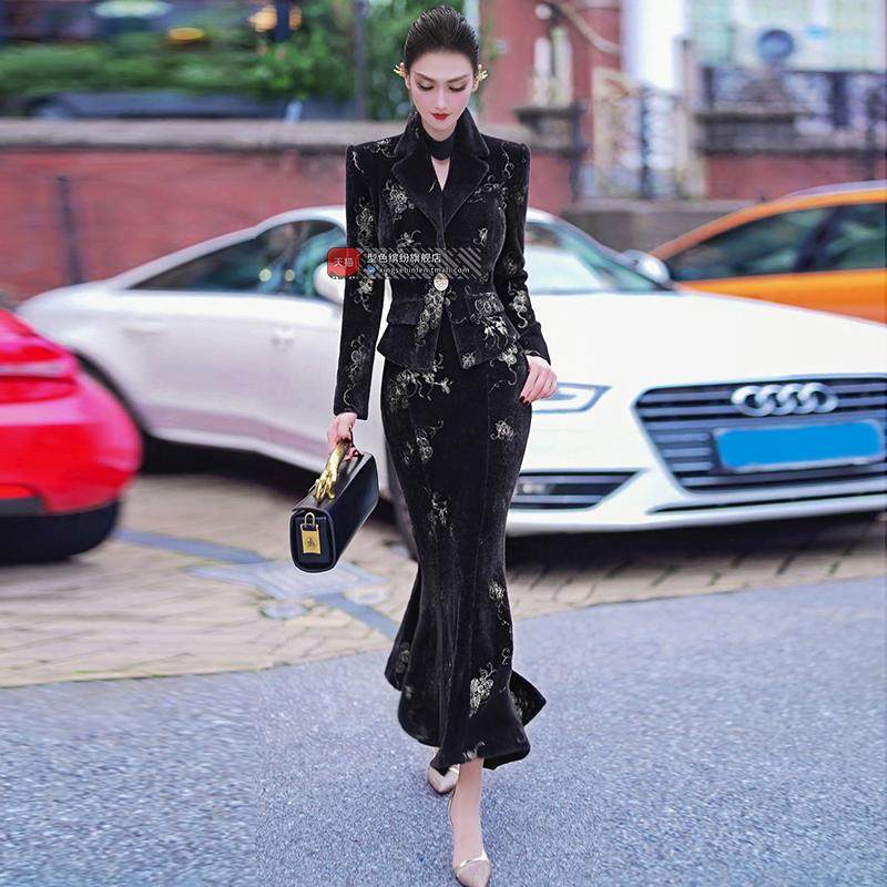 CHICHY法式撞色小香风外套套装女25冬季新款修身丝绒鱼尾裙两件套