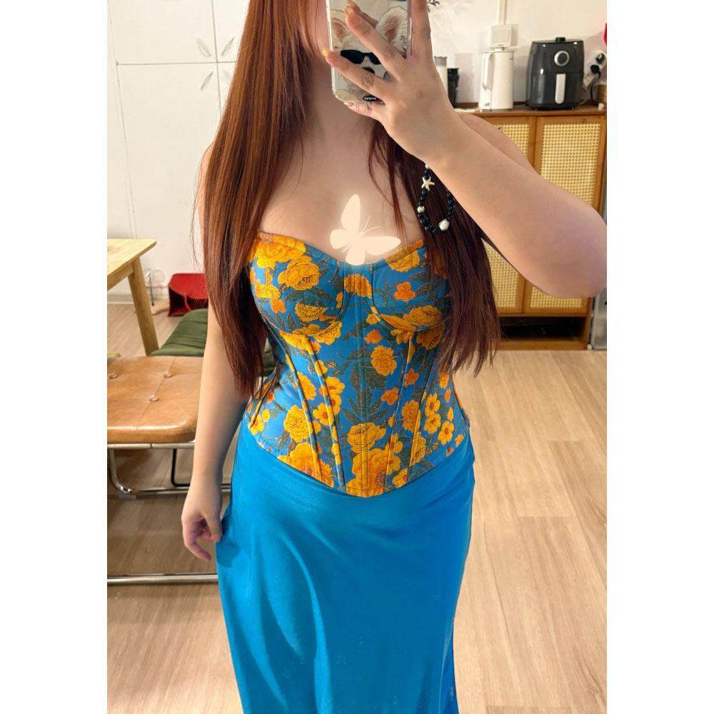 怪诞女孩 名媛贵气感收腰蕾丝鱼骨抹胸低腰缎面鱼尾半身裙两件套