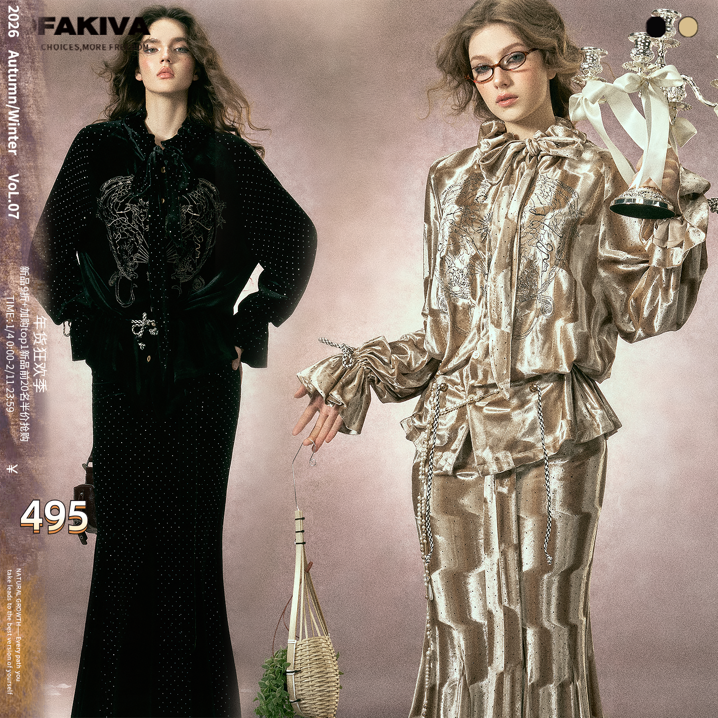 OfAkiva 复古刺绣烫钻丝绒套装原创手绘假衬衫领上衣鱼尾裙两件套