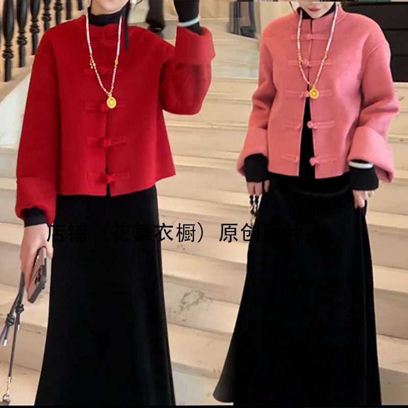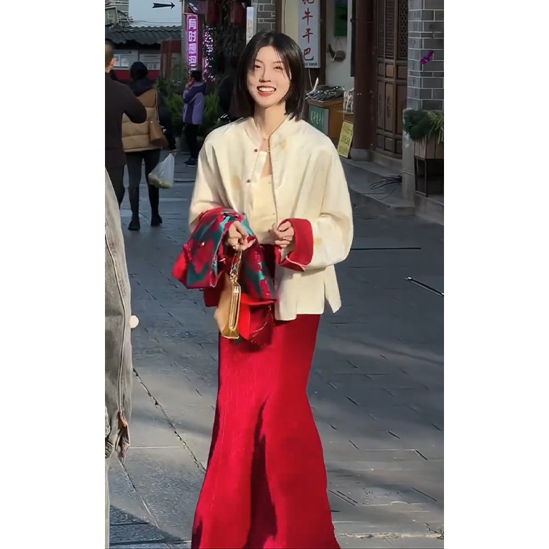 新中式盘扣外套女冬季高级感气质宽松百搭红色上衣鱼尾裙两件套装