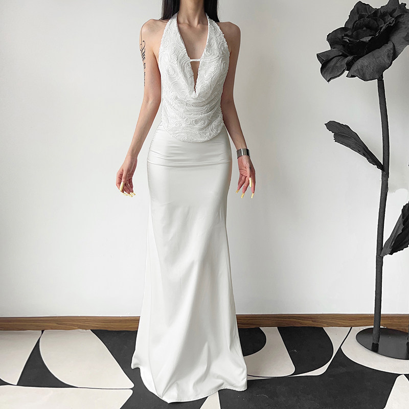 怪诞女孩 云雾白纱肌理暗纹荡领挂脖背心缎面包臀鱼尾裙两件套女
