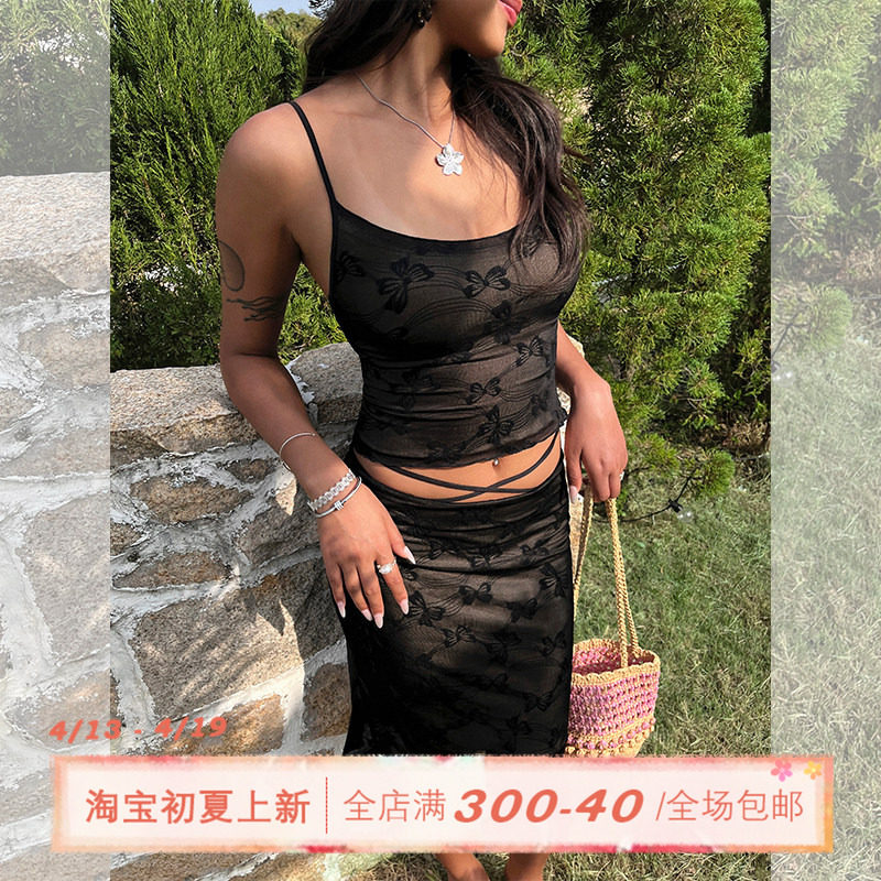 ITSNIKAR 法式植绒提花吊带套装女夏蝴蝶印花包臀鱼尾半裙两件套