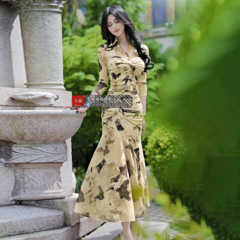 早秋时尚名媛风上衣鱼尾裙两件套2025新款气质女人味印花套装裙