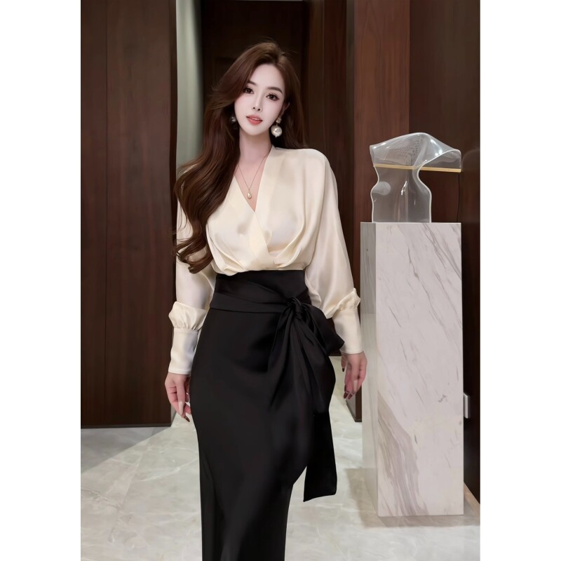 董小姐高端定制女装气质醋酸系带衬衫+醋酸鱼尾半身裙套装两件套