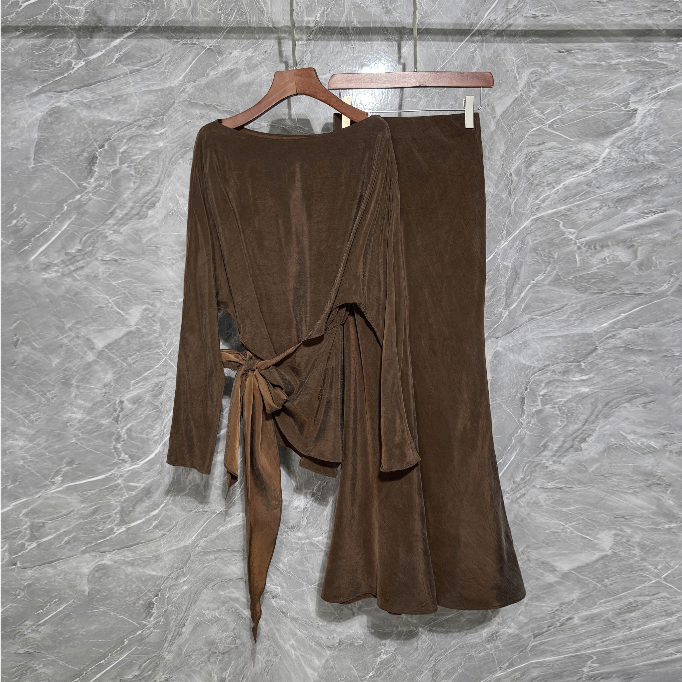 南油精品铜氨丝绉设计感套装女时尚收腰显瘦上衣斜裁鱼尾裙两件套
