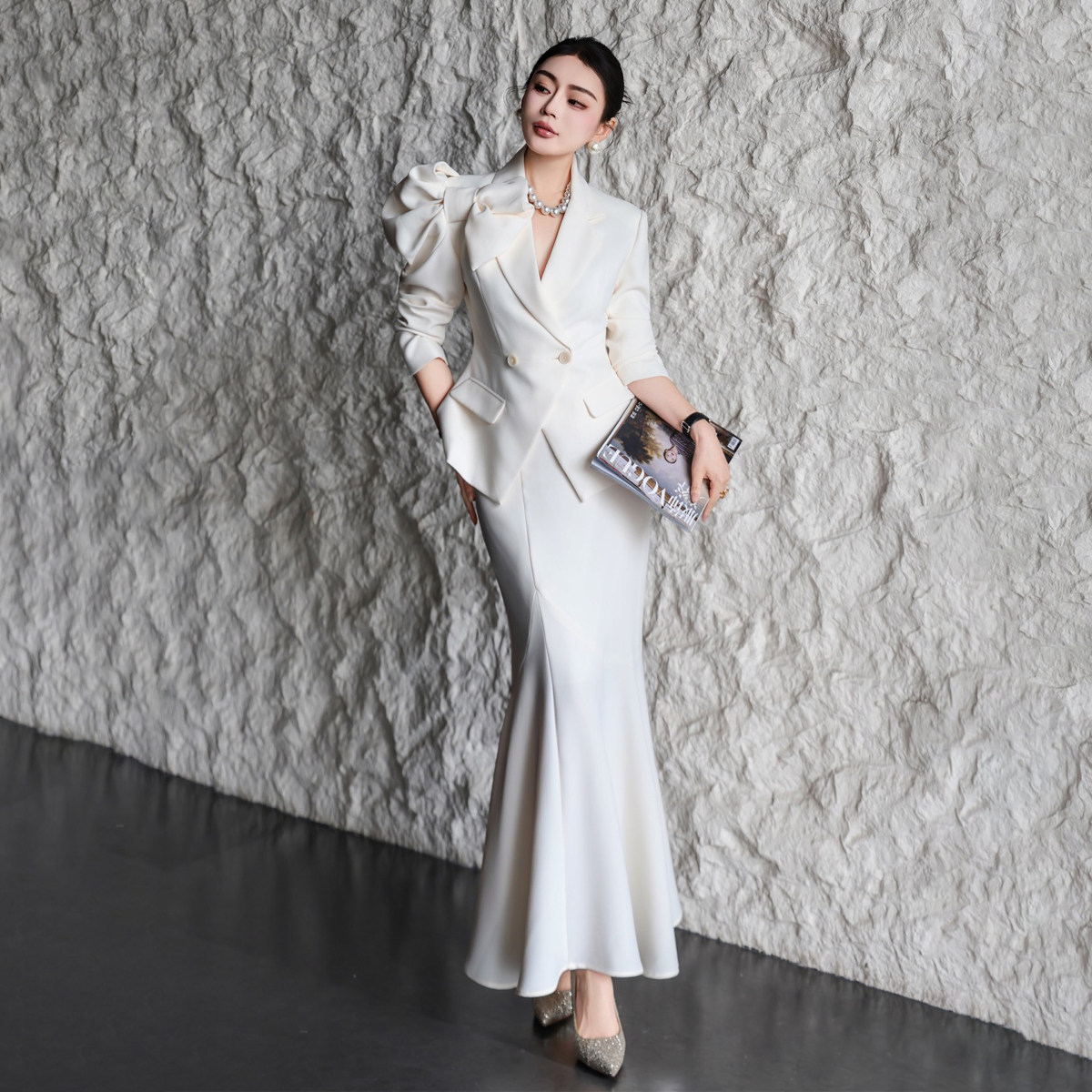 PAPERLLL辛间 宿命感女主 缎面西装+A字鱼尾半身裙套装气质两件套