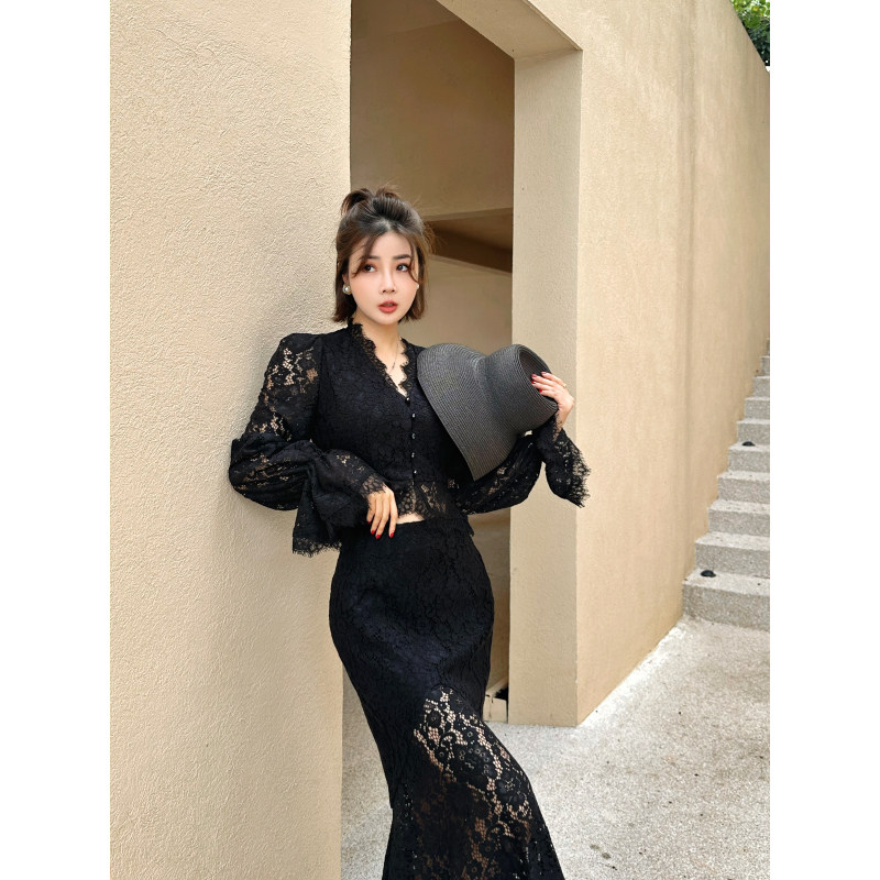 XULU原创顶ji纱线股线镂空蕾丝泡泡袖短衬衫黑色修身鱼尾裙两件套