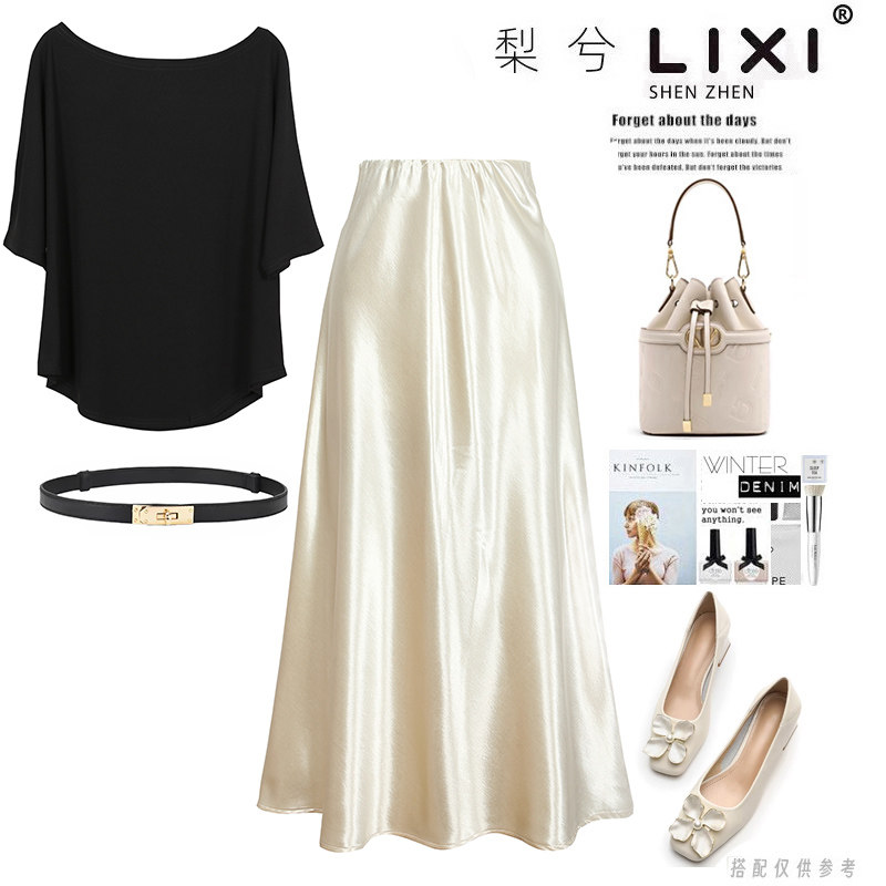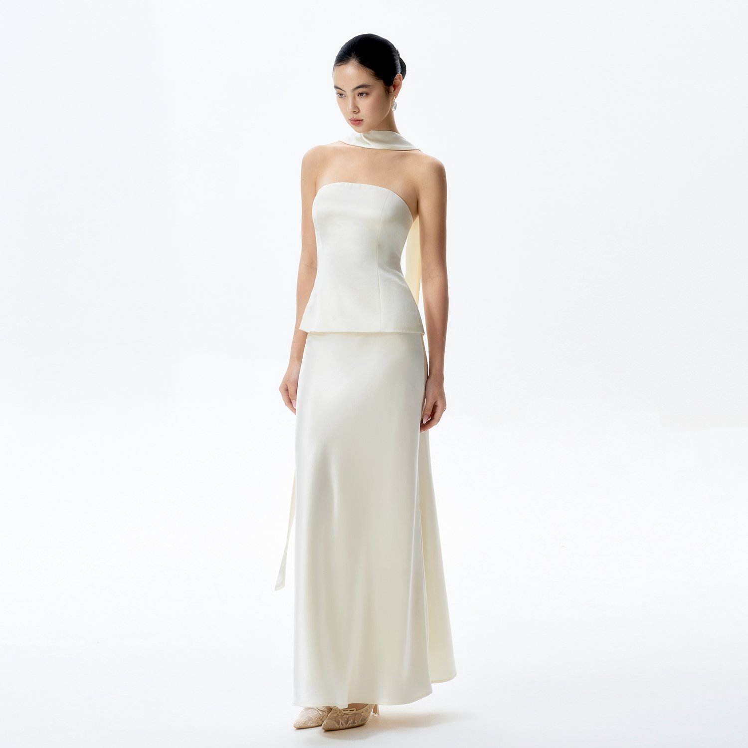 TANSSHOP 奶油色挂脖缎面套装抹胸收腰上衣 + 鱼尾半身裙两件套