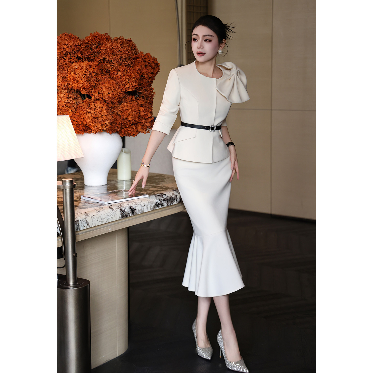 设计感春夏新款立体蝴蝶结收腰显瘦长袖西装外套鱼尾裙半裙两件套