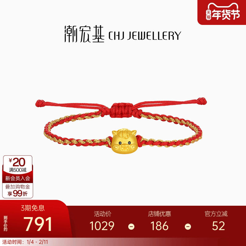 潮宏基好事发生足金手链黄金手绳5D硬金骐骥红绳生肖马本命年礼物