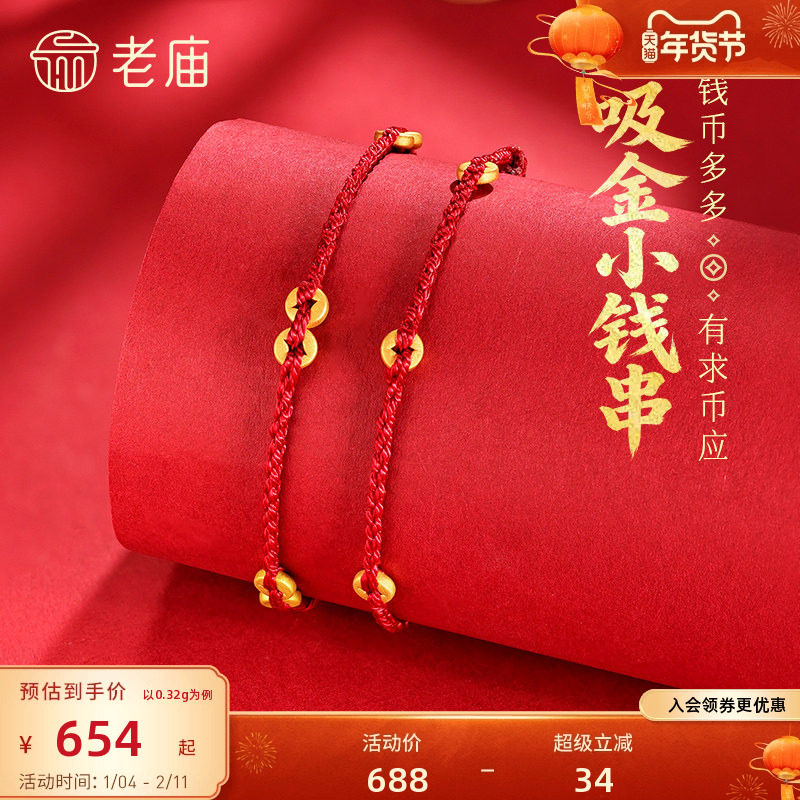 老庙黄金吸金小钱串钱币黄金手绳5D六六大顺红绳小克重礼物百搭