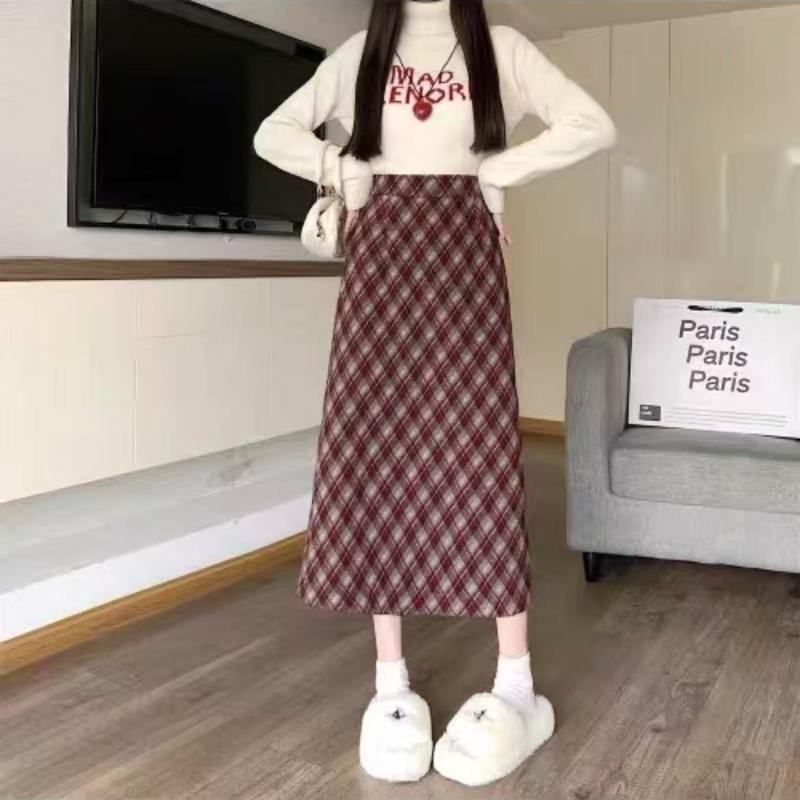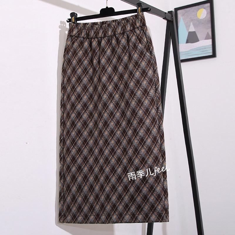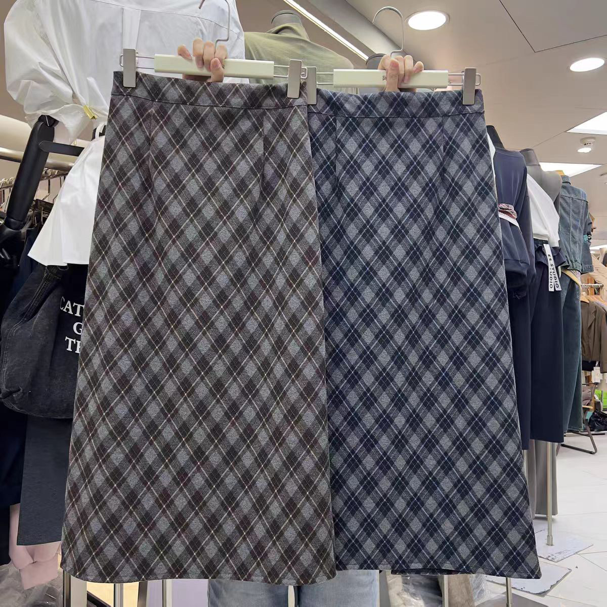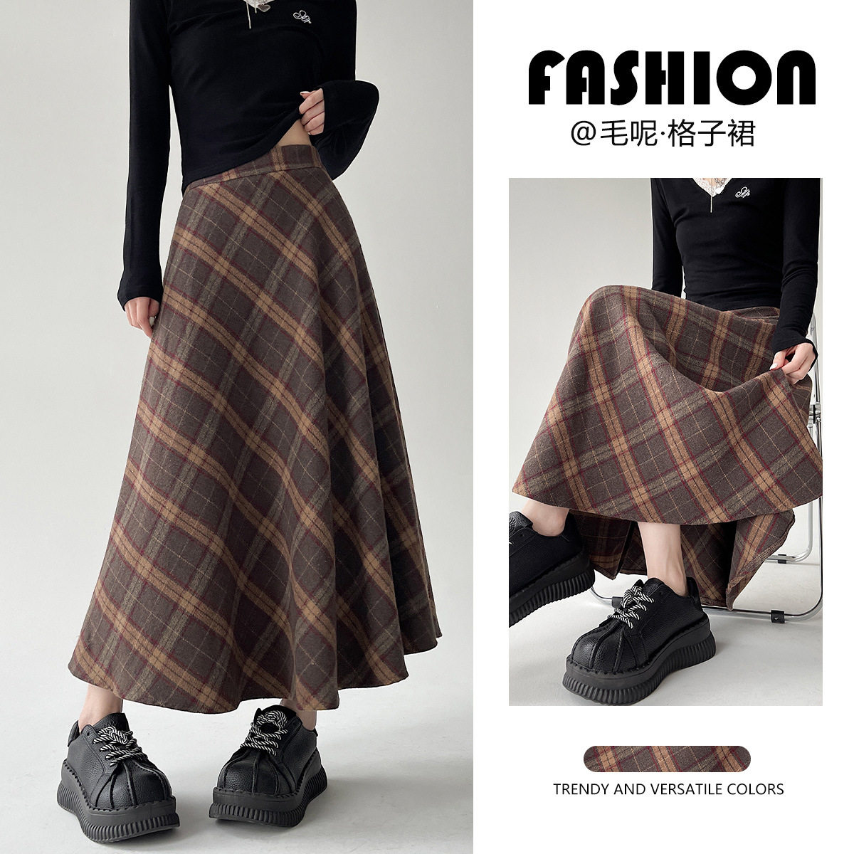 D209 春秋冬款高级感复古气质毛呢格子高腰过膝百搭显瘦半身裙