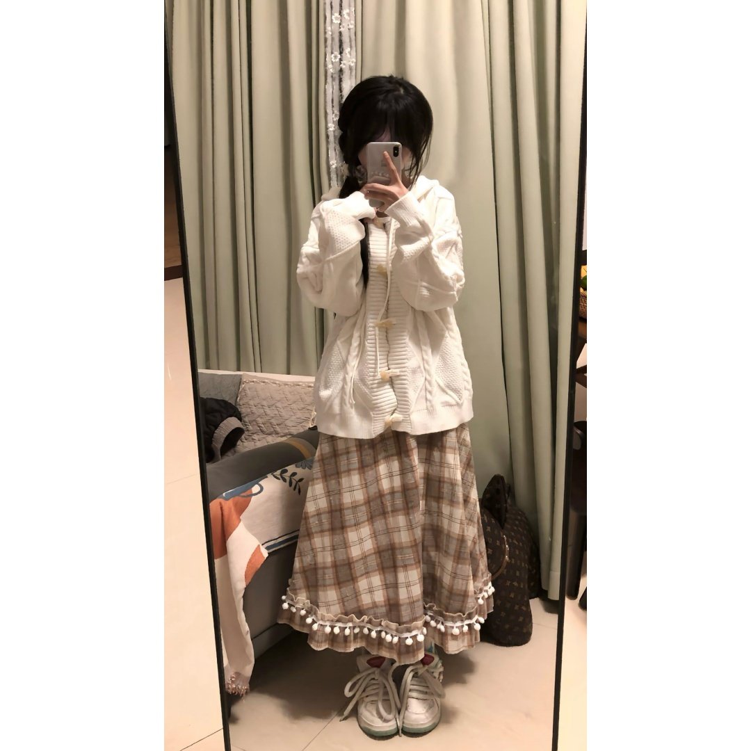 秋冬款小个子好看可爱学院牛角扣毛衣外套女+复古格纹半身裙套装