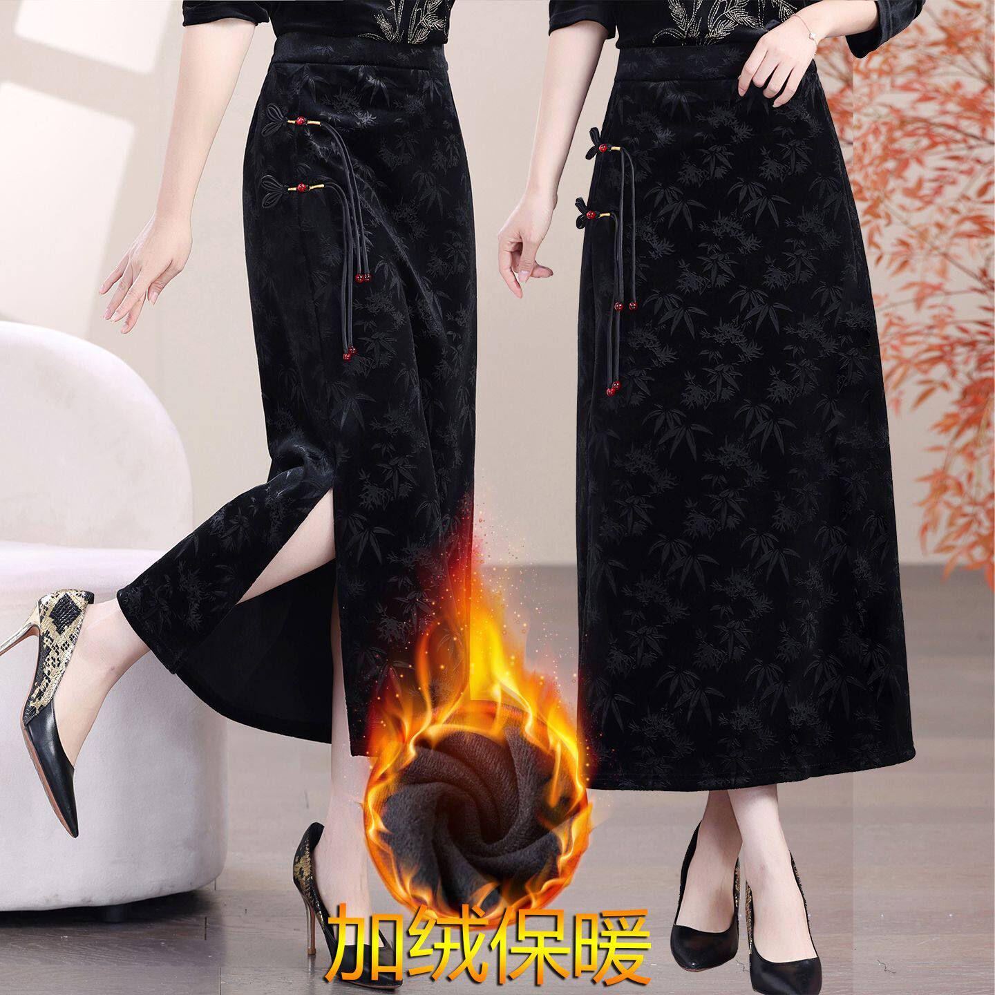 秋冬款新中式半身裙开叉中长款加绒显瘦高腰加厚国风复古提花裙子