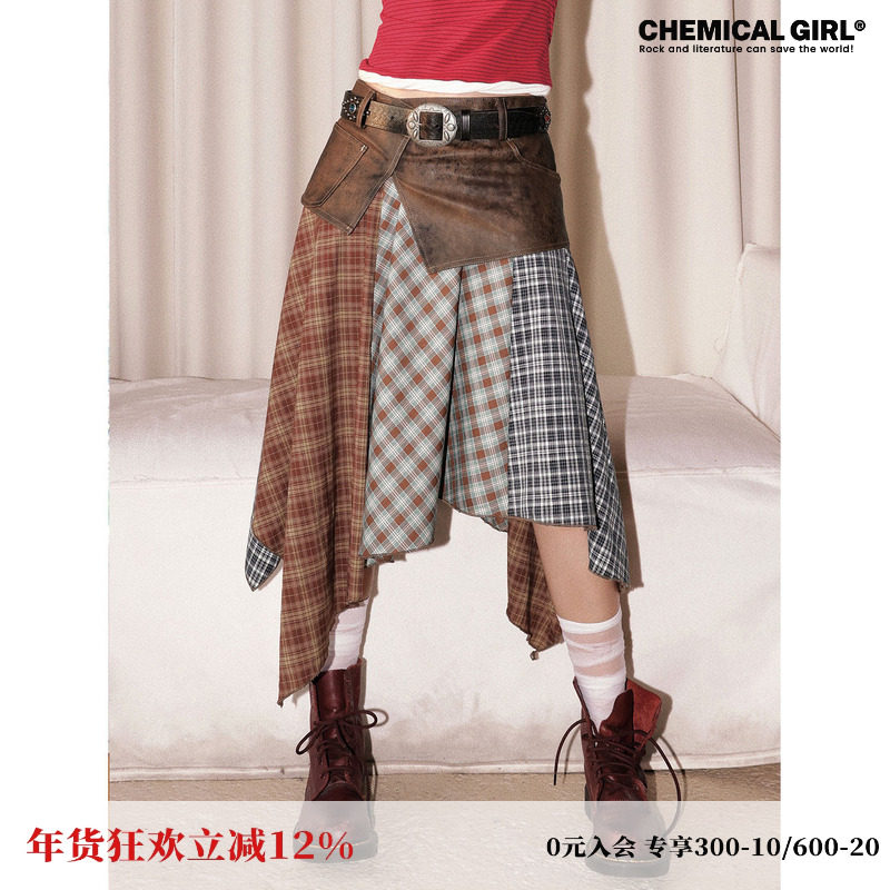 JMWOMEN饼棕方块复古抗皱格子高腰半身裙女秋冬款宽松百搭a字长裙