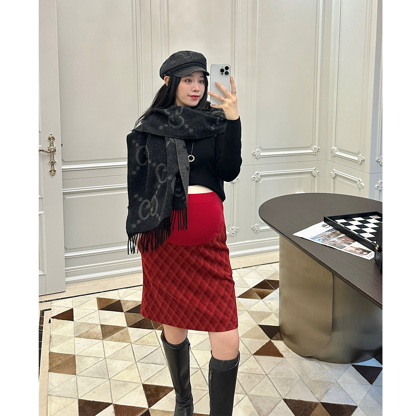 LeoMami孕妇装秋冬款新年限定复古格子半身裙包臀毛呢开叉A字半裙