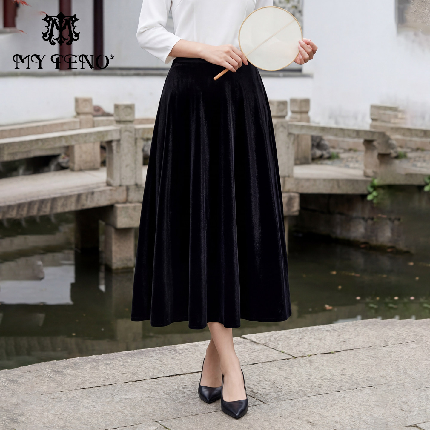 马天奴秋冬款复古丝绒半身裙女装长裙高级感伞裙气质百搭小黑裙子