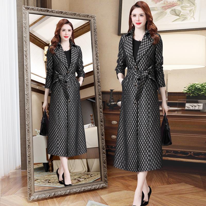 2025春秋新款欧美时尚女装风衣气质收腰印花长款过膝显瘦翻领外套