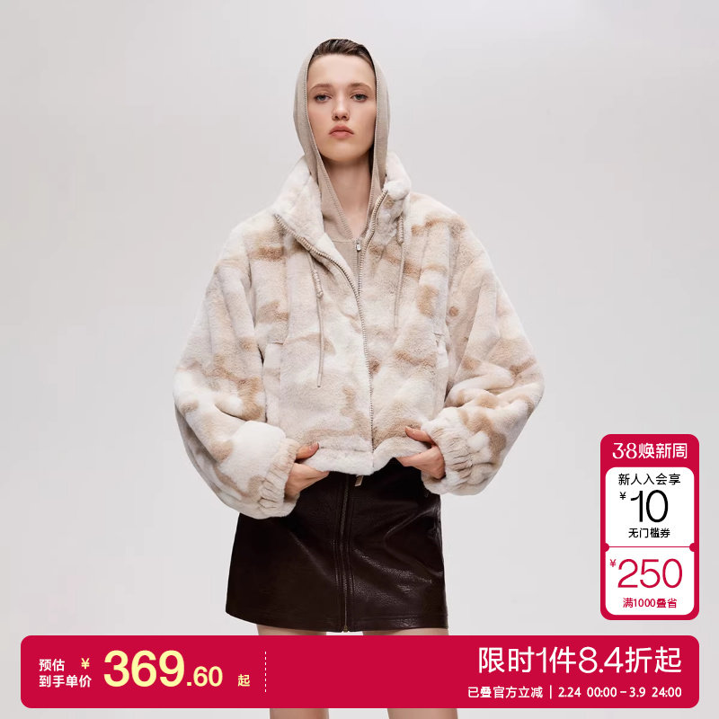 【ONLY奥莱】春季可调节抽绳下摆个性迷彩宽松短款毛绒棉服外套女