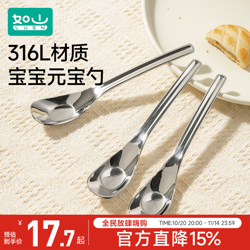 如山元宝勺子316L不锈钢儿童宝宝喂饭勺子餐勺长柄汤勺调羹汤匙