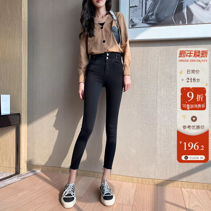 黑色两粒扣紧身高腰牛仔裤女秋季新款修身显瘦弹力九分毛边小脚裤