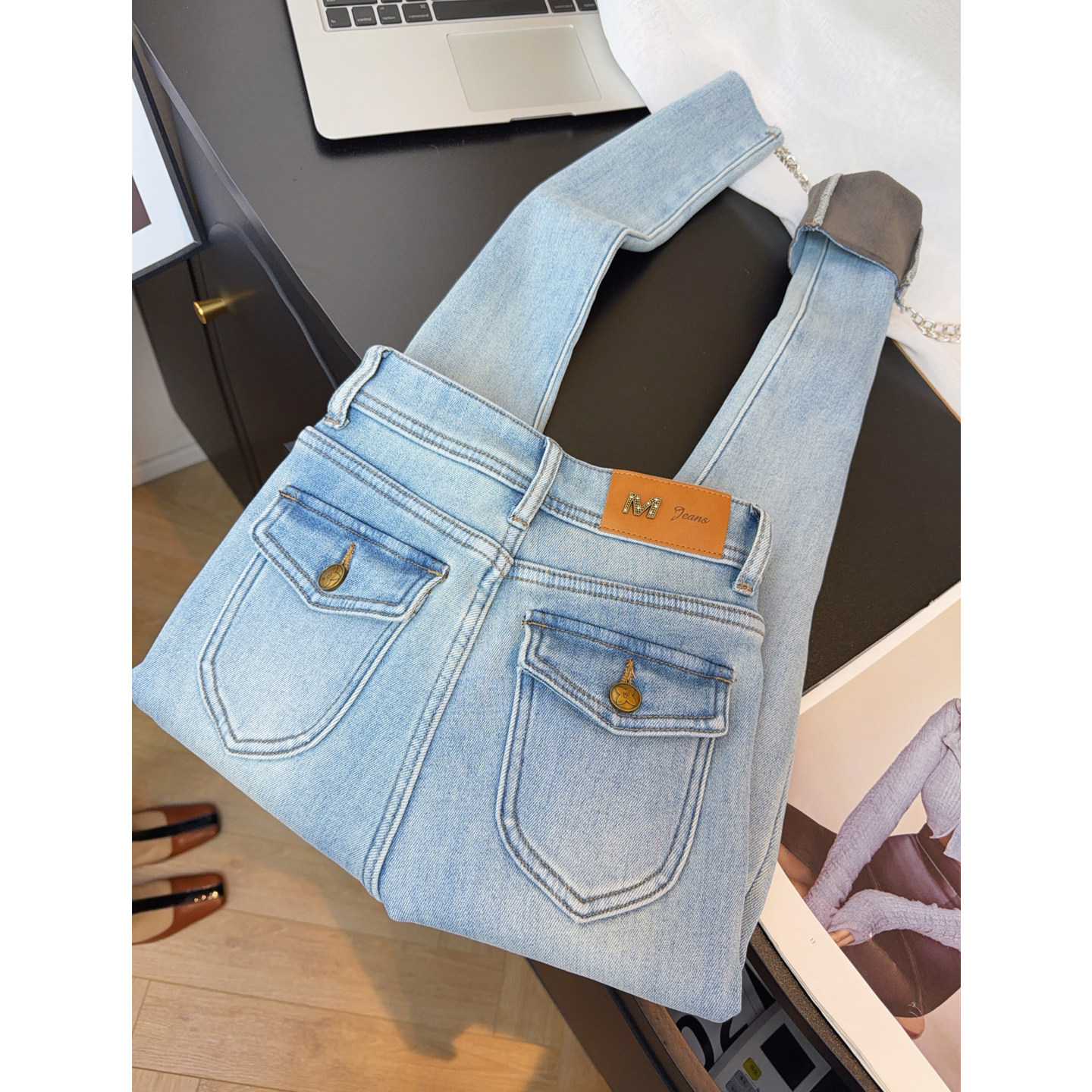 毛边浅蓝色抓绒牛仔裤女小脚铅笔裤高腰弹力2024春新款紧身九分潮