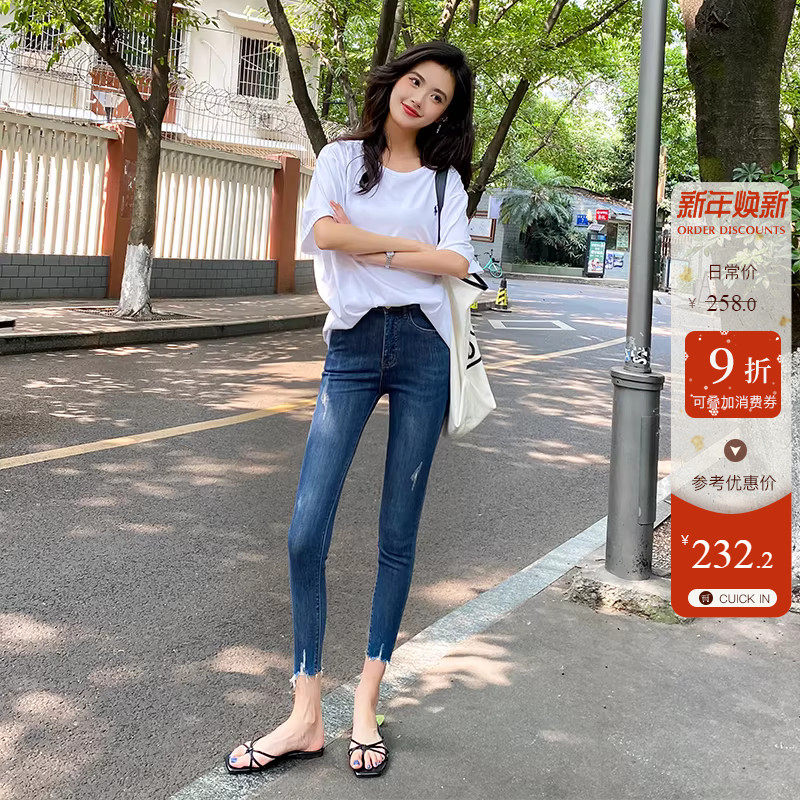 春秋新款深蓝色破洞中高腰牛仔裤女巨显瘦紧身九分弹力毛边小脚裤