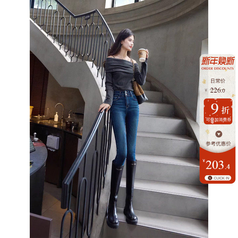 多重水洗高腰小脚牛仔裤女冬季加绒深蓝色紧身显瘦九分毛边铅笔裤