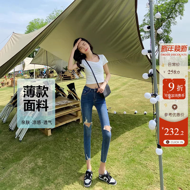 619韩版破洞毛边小脚牛仔裤女77094夏秋弹力提臀小个子显高九分裤