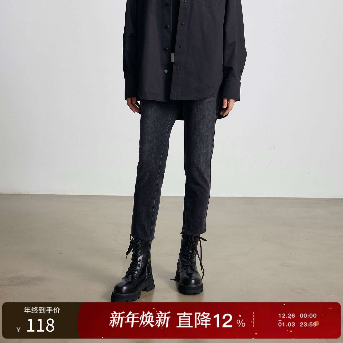 黑灰色牛仔裤女2025新款高腰显瘦毛边弹力紧身薄绒九分小脚铅笔裤