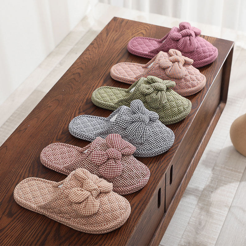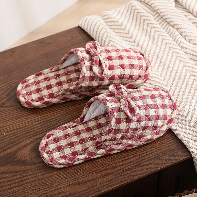 居家室内布艺布底防滑拖鞋木地板地砖情侣格子静音春秋冬季蝴蝶结