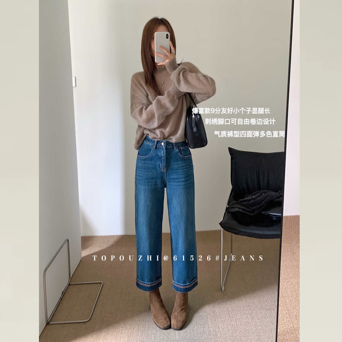 - 直筒牛仔卷边九分裤女